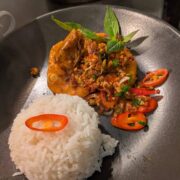 Panang curry chili paste cooked in coconut milk add meat and mix with peppers.
